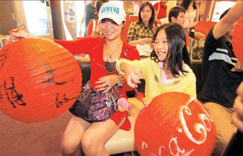 Visitors celebrate the Mid-Autumn Festival, or the 15th day of the eighth month of the Chinese lunar calendar, at the Coca-Cola Pavilion yesterday. The pavilion spread the holiday spirit by distributing red lanterns with calligraphy works. (Photo: Shanghai Daily)