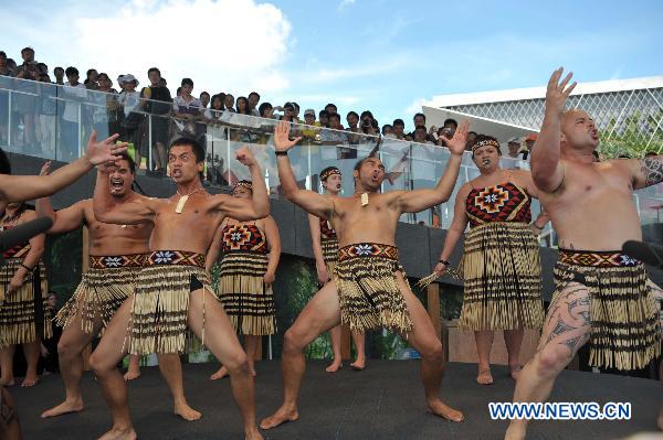 Artists perform Haka, a kind of New Zealand's traditional dancing to cheer up Maori soldiers before their battle, in 2010 World Expo Site in Shanghai, China, Aug. 7, 2010. (Xinhua/Zhou Hua)