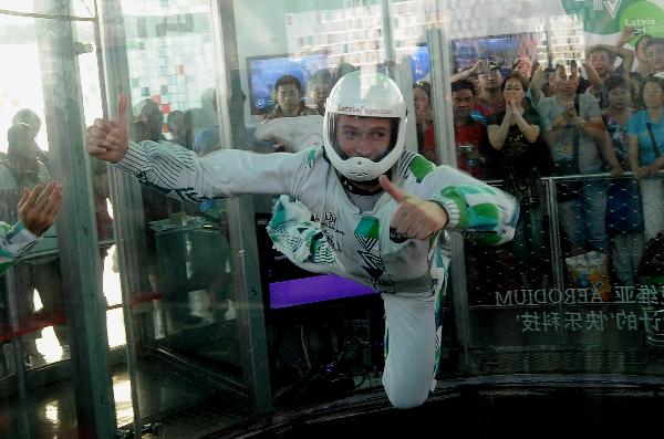 A Latvian acrobat performs in a wind tunnel which blows off winds of 200 kilometers per hour from the bottom, in the Latvia Pavilion in the Shanghai World Expo Park in Shanghai, east China, Sept. 8, 2010. (Xinhua/Lin Yiguang)