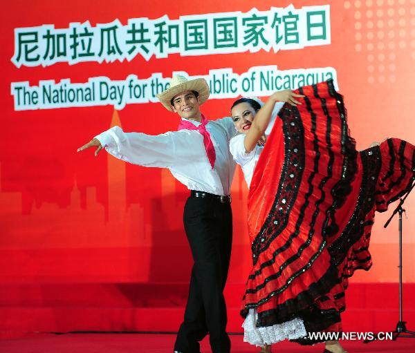Artists from Nicaragua perform during a ceremony marking the National Pavilion Day of the Republic of Nicaragua in the Shanghai World Expo Park in Shanghai, east China, Sept. 14, 2010. (Xinhua/Li Baishun)