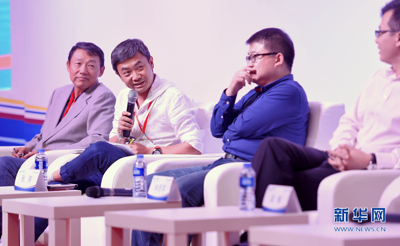 6月12日,“優(yōu)客工場(chǎng)”創(chuàng)始人毛大慶(左二)在高峰對(duì)話環(huán)節(jié)中發(fā)言。新華社記者林善傳攝