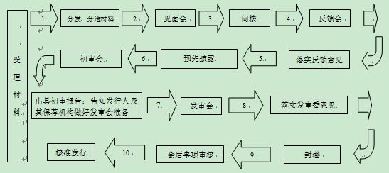 按照依法行政、公開透明、集體決策、分工制衡的要求,首次公開發行股票(以下簡稱首發)的審核工作流程分為受理、見面會、問核、反饋會、預先披露、初審會、發審會、封卷、會后事項、核準發行等主要環節,分別由不同處室負責,相互配合、相互制約。對每一個發行人的審核決定均通過會議以集體討論的方式提出意見,避免個人決斷。