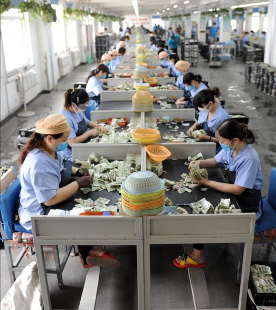 “數錢數到手抽筋”是很多人的夢想,但對於鄭州公交總公司結算中心點鈔部的120多名專職點鈔人員來說,這句話描述的正是他們每天工作所面對的現實。鄭州市公交總公司現有280多條公交線路,近四千臺公交車。每臺公交車當日收班后,投幣箱內的票膽都會被送到點鈔部,在經過統一整理送往點鈔室,分發給各位點鈔員進行人工清點。在點鈔室裡,穿著藍色工作服、戴口罩的點鈔員們先將票膽內的紙、硬幣分開﹔硬幣被送往專門的機器進行清點,紙幣清點則需要用手工方式完成。紙幣清點完畢之后,打好捆的鈔票會被送往復核組接受驗鈔機檢驗,確認無誤后再送往銀行。據介紹,每位點鈔員每天要清點約60個投幣箱,1萬余張紙鈔。新華社記者 李博 攝