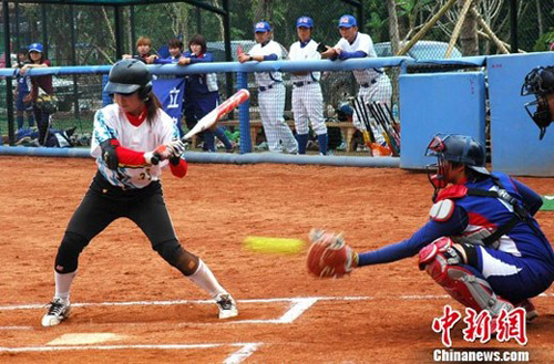 4月2日下午,“2011楠景新城杯·海峽兩岸女子壘球賽”在云南西雙版納楠景新城棒壘球訓(xùn)練基地舉行。圖為臺(tái)北體育學(xué)院隊(duì)與廣東女壘進(jìn)行比賽。 中新社發(fā) 楊穎融 攝