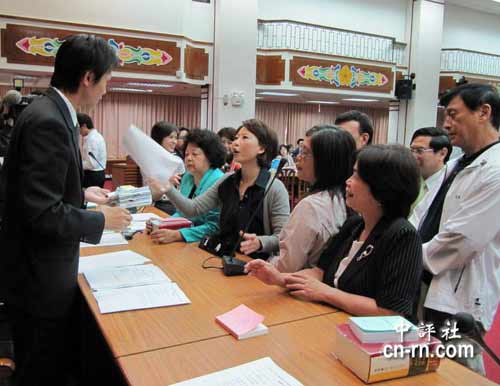 資料圖:綠營阻撓大陸學生來臺就學,主席黃志雄要宣布議事規(guī)則,“綠委”就是不讓主席說話。