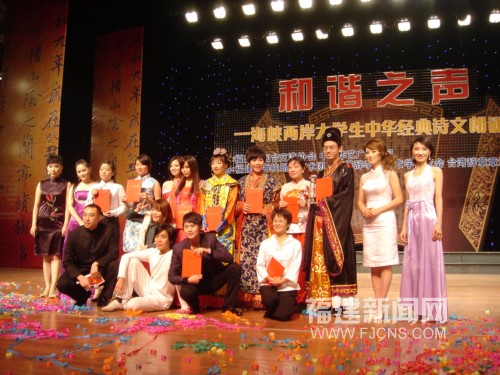福建新聞網福州11月29日電(沈靜)悠悠民樂、朗朗誦讀,“就是那一只蟋蟀,在《唐風·蟋蟀》里唱過,在《古詩十九首》里唱過,在花木蘭的織機旁唱過,在姜夔的詞里唱過”,二十九日晚,“和諧之聲”——首屆海峽兩岸大學生中華經典詩文朗誦大賽決賽暨頒獎晚會在福州大戲院隆重舉行,來自臺灣臺北大學的葉士銘和來自福建師范大學的趙玉以精彩的表現在十位選手中脫穎而出,獲得了一等獎,福建師范大學臺灣籍學生黃懿鳳、福建中醫學院臺灣籍學生張力友等獲得二等獎,臺灣臺北大學林芷卉、臺灣開南大學楊玉鳳等獲得三等獎。