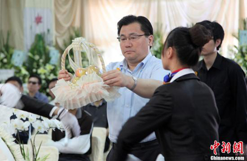 在殯儀館景德廳,白色的菊花、百合、蝴蝶蘭簇擁著罹難者的遺像,供桌上香煙升騰,果品點心一字擺開。罹難者家屬分別行三跪九叩大禮拜別親人后,公奠儀式正式開始。
