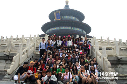 臺(tái)灣南部旅游院系學(xué)生交流參訪團(tuán)與大陸學(xué)生在天壇祈年殿前合影留念。(中國臺(tái)灣網(wǎng) 王曉蕊 攝)