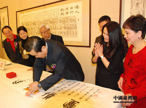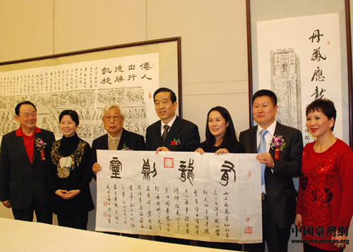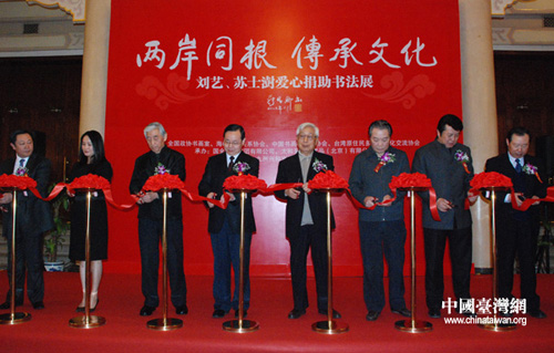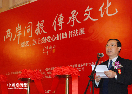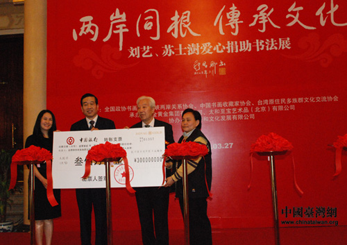 中國(guó)臺(tái)灣網(wǎng)3月28日北京消息 由全國(guó)政協(xié)書(shū)畫(huà)室、中國(guó)書(shū)畫(huà)收藏家協(xié)會(huì)主辦的“兩岸同根,傳承文化——?jiǎng)⑺嚒⑻K士澍愛(ài)心捐助書(shū)法展”昨日上午在全國(guó)政協(xié)禮堂隆重舉行。活動(dòng)共展出劉藝、蘇士澍兩位當(dāng)代著名書(shū)法家作品80余幅。同時(shí),兩位名家還當(dāng)場(chǎng)向臺(tái)灣省花蓮縣秀林鄉(xiāng)捐贈(zèng)人民幣300萬(wàn)元籌建“愛(ài)心圖書(shū)館”。原全國(guó)政協(xié)副主席、政協(xié)書(shū)畫(huà)室主任張思卿,海峽兩岸關(guān)系協(xié)會(huì)副會(huì)長(zhǎng)王在希,臺(tái)灣地區(qū)少數(shù)民族民意代表高金素梅等出席活動(dòng)。
