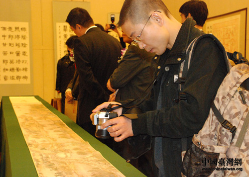嘉賓們認(rèn)真參觀現(xiàn)藏于臺(tái)北故宮博物院的清院本《清明上河圖》。(中國(guó)臺(tái)灣網(wǎng) 劉瑩 攝)