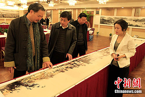 4月1日,臺(tái)灣著名畫家許文融(左一)在上海介紹其創(chuàng)作的320米水墨畫《臺(tái)灣風(fēng)物圖長卷》。其真跡將于4月22日在上海美術(shù)館公展,屆時(shí)將揭開紀(jì)念辛亥革命100周年滬臺(tái)文化交流活動(dòng)序幕。《臺(tái)灣風(fēng)物圖長卷》再現(xiàn)了寶島自然山川、人文建設(shè)和信仰民俗。中新社發(fā) 潘索菲 攝