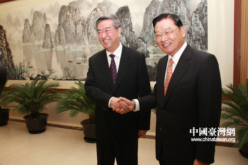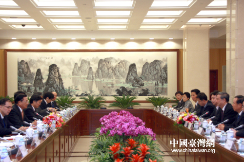 10月29日,臺灣海基會董事長江丙坤率領的海基會新聞交流團一行訪問新華社。這是新華社社長李從軍會見江丙坤一行。(中國臺灣網 田云鵬 攝)