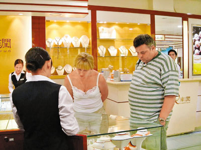 海南省從2011年元旦日開始率先試行離境退稅政策,包括香港人在內(nèi)的境外游客在指定商店購(gòu)買退稅物品達(dá)800元人民幣,可以退回11%的稅。圖為外國(guó)游客在海南購(gòu)物