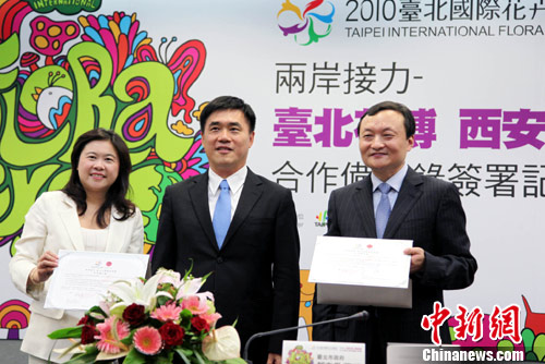 7月22日,“兩岸接力——臺北花博西安世園合作備忘錄”在臺北簽署,兩市約定將共同在文化與花藝展開密切的交流與合作,在兩個博覽會期間互相參展,并協助對方舉辦“城市文化日”或“文化周”等活動,以傳揚綠色理念。圖為臺北市長郝龍斌(中)副市長李永萍(左)、西安世園會執委會副主任王軍(右)展示備忘錄內容。據悉,臺北國際花卉博覽會將于今年11月舉辦,理念為“結合文化與藝術之綠色生活”;西安世界園藝博覽會將于明年4月28日至10月22日舉行,宣傳口號為“綠色引領時尚。