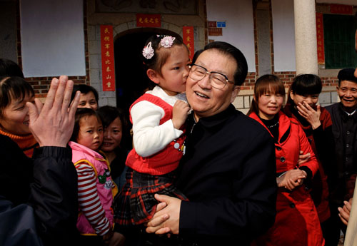 這是3月25日,李長春在莆田市西天尾鎮龍山村調研時和藹地抱起一名小朋友。