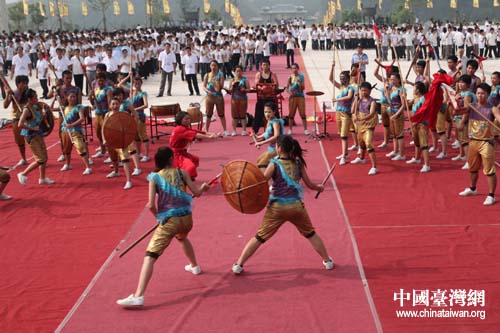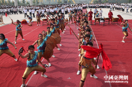 中國(guó)臺(tái)灣網(wǎng)8月9日隨州消息 今天上午,炎帝神農(nóng)祭祀大典在神農(nóng)故里隨州市舉行。大典上,臺(tái)灣大學(xué)生為在場(chǎng)嘉賓獻(xiàn)上了一場(chǎng)頗具臺(tái)灣特色的“宋江陣”表演,這也是臺(tái)灣“宋江陣”首次亮相大陸。