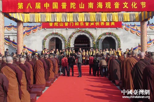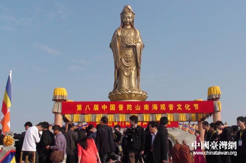 中國臺灣網11月5日舟山消息 今天上午,第八屆中國南海觀音文化節在浙江普陀山南海觀音大佛廣場隆重開幕。臺灣南鯤鯓代天府和臺灣靈鷲山等佛教交流團共200余人應邀參加文化節。