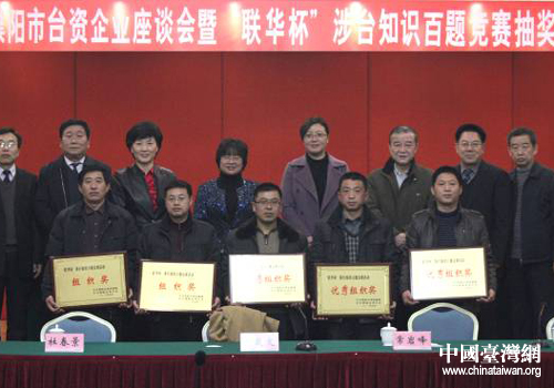 中國臺灣網1月15日濮陽消息 日前,濮陽市“聯華杯”涉臺知識百題競賽抽獎儀式在濮陽迎賓館舉行,現場抽取了一、二、三等獎及紀念獎共135名。省臺辦副主任杜春景,濮陽市委常委、統戰部長王載文,副市長郭巖松,市委對臺工作領導小組成員、各縣(區)臺辦主任及部分臺商出席抽獎儀式,特邀4名參賽群眾代表參加儀式。