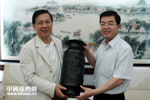 濟(jì)南市副市長(zhǎng)張海波向臺(tái)灣鄉(xiāng)林集團(tuán)董事長(zhǎng)賴正鎰贈(zèng)送黑陶藝術(shù)品。(圖片來源:山東省臺(tái)辦)