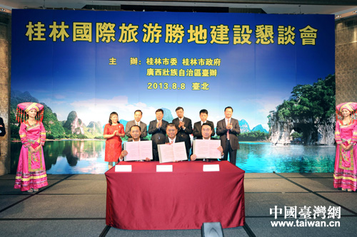 桂林旅游發(fā)展總公司、桂林旅游股份有限公司與臺灣旅行商業(yè)同業(yè)公會在臺北簽署旅游合作備忘錄。(圖片來源:廣西臺辦)