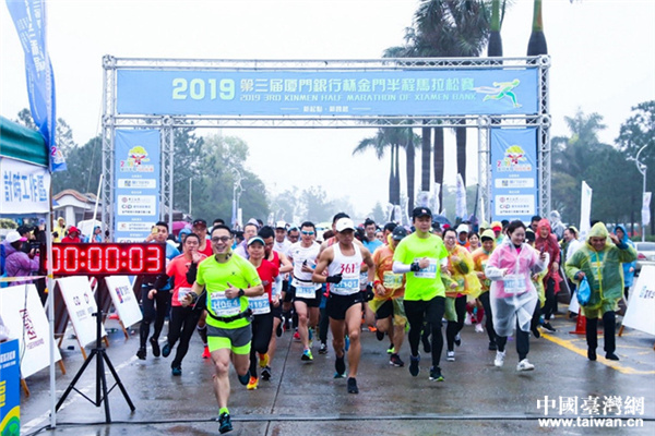 中國臺灣網3月13日金門訊 碧瓦白墻,紅磚古厝。3月10日上午,第三屆廈門銀行杯金門半程馬拉松賽在金門大學拉開帷幕。來自海峽兩岸的近千名馬拉松愛好者齊聚一堂,在金門賽道上揮灑激情與汗水。