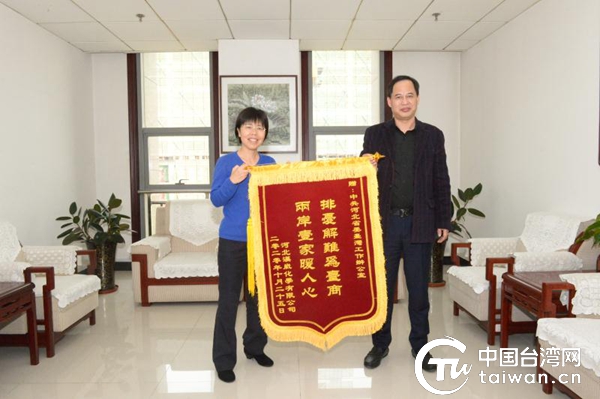 臺商吳易達向省委臺辦臺胞服務中心主任蘇雪茹贈送錦旗。(河北省委臺辦供圖)