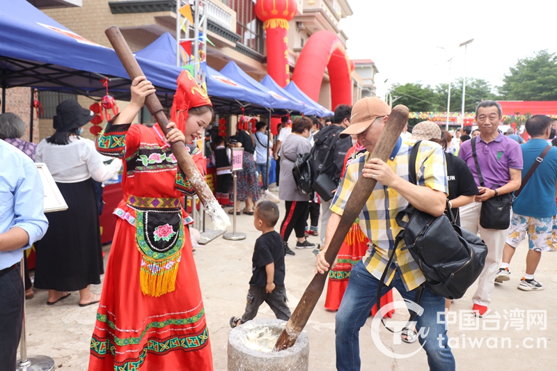 臺胞與壯族鄉親一起打糍粑(圖片來源:廣西北海市臺辦)