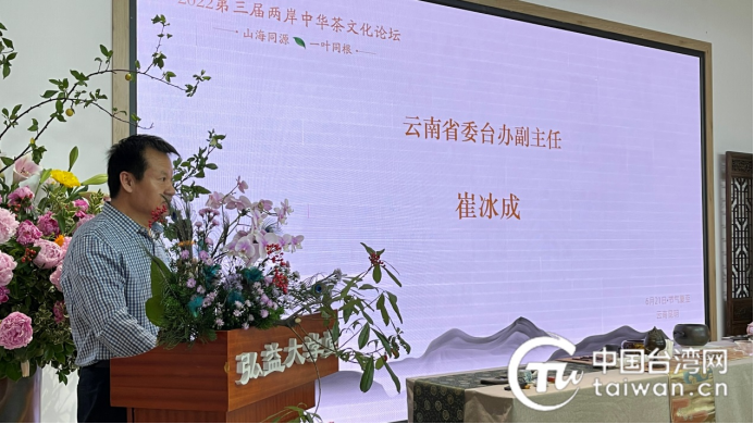 云南省委臺辦副主任崔冰成在論壇上致辭表示:兩岸同文同種,血濃于水的天然紐帶任何力量切割不斷,和平發展是兩岸人民的共同心愿。今天云臺兩地的同胞們克服疫情不利影響,以線下線上相結合的方式在這里相聚,兩岸一脈茶香,產業互補性強,合作空間廣闊,在產業創新、人才培訓、茶文化交流等方面仍有很大合作空間,兩岸茶人應攜手同行加強合作,充分挖掘展示兩岸茶文化和茶產業,探索新形勢下兩岸茶文化的不斷融合創新,持續深化兩岸茶文化的交流和茶產業的合作,共同將中華茶文化發揚光大,形成傳承中華文化的強大合力。