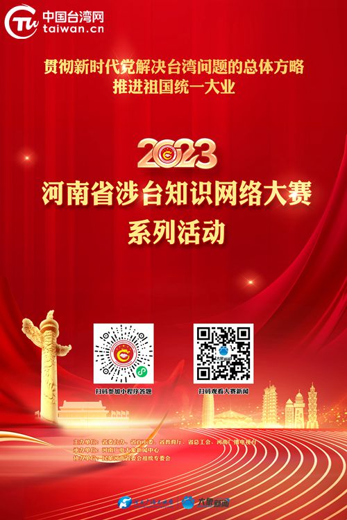 中國臺灣網3月27日訊 為進一步深入學習宣傳貫徹黨的二十大精神,扎實推進涉臺宣傳教育工作,由河南省委臺辦、省直工委、省教育廳、省總工會、河南廣播電視臺聯合主辦,河南廣電大象新聞中心承辦,民革河南省委會祖統專委會協辦的“貫徹新時代黨解決臺灣問題的總體方略,推進祖國統一大業”2023年河南省涉臺知識網絡大賽將于3月28日正式啟動。