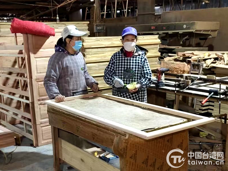 “這就是我們的家具生產線,專門生產面向臺灣以及香港、澳門、廣州、深圳等消費市場的傳統品牌木制家具和賓館、寺廟等用具!焙映厥姓d木業有限責任公司職工黃秋梅介紹,“公司現在的生產線車間訂單已經排到5月,客戶都在等待著產品,現在我們為了順利按期交貨,都在加班加點與時間賽跑!
