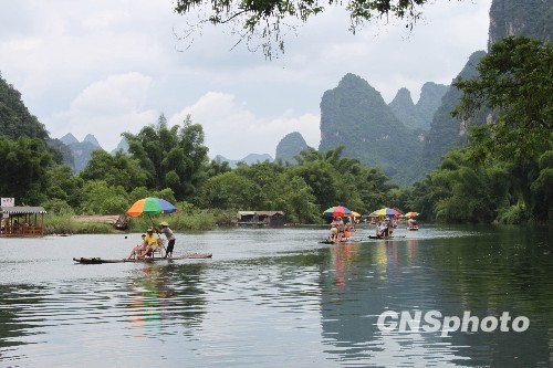 7月23日,游客在廣西桂林陽朔縣遇龍河景區漂流。當日,桂林市旅游局的統計數據顯示,今年1—6月,桂林市接待海內外游客近千萬人次,達到了967.89萬人次,同比增長22.15%。 中新社發 周利朔 攝