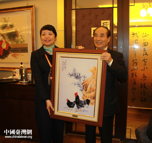 2011年4月18日,臺灣十大杰出青年基金會歡送大陸高校師生參訪團(tuán)一行,圖為十大杰出青年基金會王金平董事長與中國宋慶齡基金會聯(lián)絡(luò)部陳愛民部長互換禮物。(中國臺灣網(wǎng) 楊永青 攝)