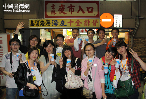 2011年4月10日,大陸高校參訪團(tuán)的學(xué)生們前往臺北士林夜市品嘗特色小吃,在夜市入口處合影留念。(中國臺灣網(wǎng) 楊永青 攝)