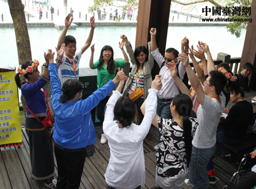 2011年4月12日,大陸高校師生在日月潭風(fēng)景區(qū)與原住民一起載歌載舞。(中國臺灣網(wǎng) 楊永青 攝)
