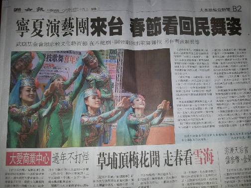 本次演出,也受到了臺(tái)灣新聞媒體的廣泛關(guān)注。臺(tái)南、高雄、南投等十幾家電視臺(tái)以及《聯(lián)合報(bào)》、《民眾日?qǐng)?bào)》、《焦點(diǎn)新聞》等報(bào)紙和網(wǎng)站等媒體,對(duì)寧夏民族歌舞雜技演出情況進(jìn)行了宣傳報(bào)道。在演出預(yù)熱階段,邀請(qǐng)方在高雄舉辦了由《聯(lián)合報(bào)》、《民眾日?qǐng)?bào)》、《焦點(diǎn)新聞》等報(bào)紙和“中視”媒體參加的新聞發(fā)布會(huì)。會(huì)后眾多媒體紛紛刊發(fā)宣傳報(bào)道,1月29日,《聯(lián)合報(bào)》頭版頭條刊登新聞,題目為《寧夏演藝團(tuán)來(lái)臺(tái) 春節(jié)看回民舞姿》,并附上一幅美麗的回族姑娘跳舞的劇照。報(bào)道中評(píng)價(jià):“寧夏演藝團(tuán)赴臺(tái),讓臺(tái)灣民眾更了解大陸多方面的文化,讓臺(tái)灣民眾春節(jié)更高興。婀娜多姿的回族舞蹈不僅提供了民眾春節(jié)期間的休閑盛宴,也促進(jìn)了兩岸文化交流”。高雄市榮民之家專門致“茲感謝寧夏演藝集團(tuán)蒞臨本家舉辦敬老關(guān)懷活動(dòng),嘉惠榮民,特贈(zèng)此狀,以表謝忱”的感謝狀。獨(dú)具特色的回族歌舞雜技在島內(nèi)掀起了一股“寧夏旋風(fēng)”。