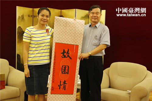 9月22日下午,海南省政協(xié)副主席王應際接見參加“回娘家慶中秋——海南新娘回鄉(xiāng)省親交流活動”的在臺瓊籍新娘省親團一行。圖為海南省政協(xié)副主席王應際和參加本次活動在臺瓊籍海南新娘互贈禮物 (中國臺灣網(wǎng) 郜利敏 攝)