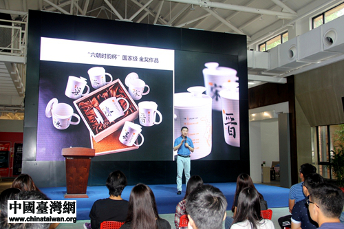南京創意設計中心主任王子燁向海外臺灣留學生長三角研習營營員們介紹具有南京元素的創意設計精品。(中國臺灣網記者 李杰 攝)