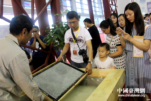第六屆江蘇書展上的文化推廣活動——現(xiàn)場古法造紙演示。(中國臺灣網(wǎng)記者 李杰 攝)