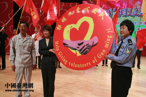郭明義為滄州市20支志愿服務組織頒發“郭明義愛心團隊”標牌。(中國臺灣網 郜利敏 攝)