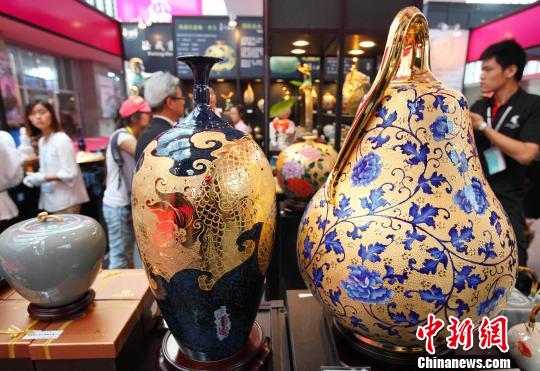 9月20日,在江蘇南京舉辦的2012臺灣名品交易會上,文創(chuàng)金點(diǎn)館內(nèi)展出的臺灣雕金彩瓷格外的搶眼。中新社發(fā) 泱波 攝