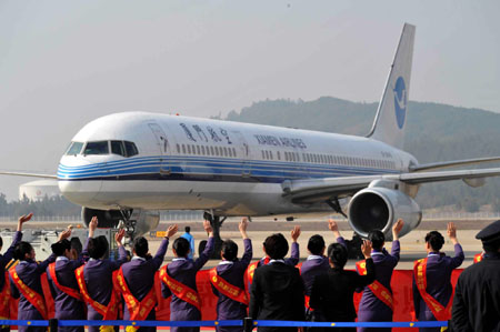 在兩岸定期航班實(shí)施之后,廈航的航班量居大陸第四位,僅次于東航、南航、國(guó)航三大航空公司。目前廈門(mén)航空公司在廈門(mén)、福州、杭州、長(zhǎng)沙4個(gè)航點(diǎn)每周執(zhí)行11個(gè)往返班次的兩岸航班,其中廈門(mén)—臺(tái)北松山每周4班(往返),福州—松山每周4班(往返),杭州—桃園每周1班(往返),長(zhǎng)沙—桃園每周2班(往返)。日前廈航申請(qǐng)加密這4個(gè)航點(diǎn)的航班,從農(nóng)歷臘月二十七開(kāi)始到正月十五,廈門(mén)航空已申請(qǐng)加開(kāi)廈門(mén)至臺(tái)北松山機(jī)場(chǎng)、福州至臺(tái)北松山機(jī)場(chǎng)8個(gè)班次,往返閩臺(tái)的兩岸同胞出行更加方便了。