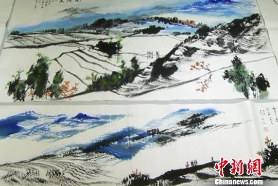 圖為兩岸和平文化藝術聯盟會秘書長李沃源展示其畫作《元陽梯田》。 楊華偉 攝