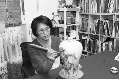 臺灣畫家高春英正在陶瓷上作畫。