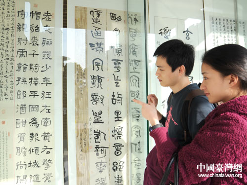 中國臺(tái)灣網(wǎng)1月5日上海消息 樹綠、花開——雖是初冬,卻如暖秋。人文藝術(shù)氛圍讓人浸心——上海戲劇學(xué)院建院65周年的映像定格在2010年12月1日。筆者應(yīng)邀參加了校慶的部分活動(dòng)。在圖書館,上海戲劇學(xué)院、上海市書法家協(xié)會(huì)聯(lián)合舉辦的第二屆研究生班、第一屆本科書法班舉辦的書法作品畢業(yè)展覽吸引了不少校友、藝術(shù)家、學(xué)者和參觀者。