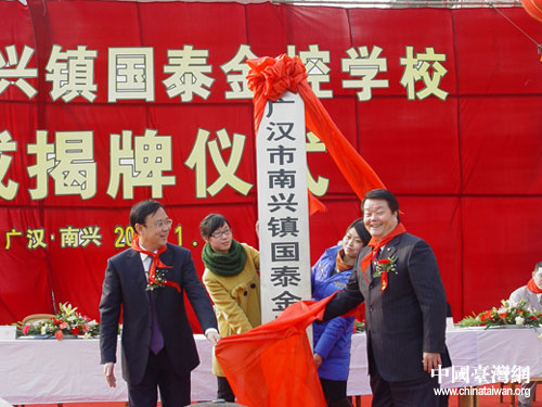 中國臺(tái)灣網(wǎng)1月13日德陽消息 日前,在新落成的廣漢市南興鎮(zhèn)國泰金控學(xué)校內(nèi),鑼鼓喧天,彩旗飄飄,由臺(tái)灣國泰人壽慈善基金會(huì)捐資1300萬元人民幣援建的廣漢市南興鎮(zhèn)國泰金控學(xué)校落成揭牌儀式在這里舉行。