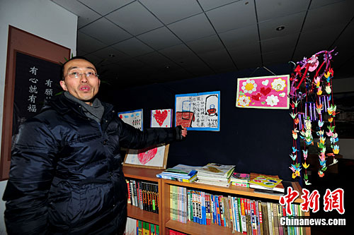 圖為慈濟工作者介紹服務中心內當地小孩的繪畫手工作品。(中新社發 安源 攝)