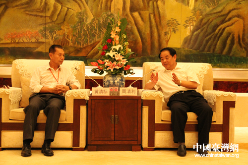 淄博市委副書記、市長周清利會見“2012海外臺商齊魯行”考察團一行,圖為周清利與來自巴西的臺商黃清標交談。(圖片來源:淄博臺辦)
