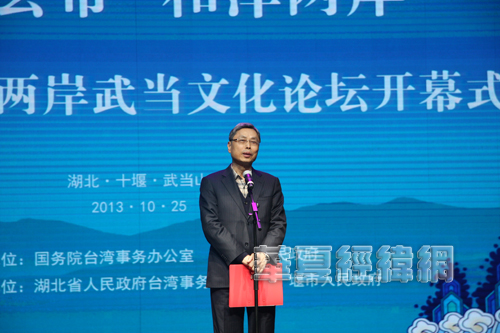 海峽兩岸關系協會副會長蔣耀平代表國臺辦、海協會對第三屆海峽兩岸武當文化論壇開幕表示祝賀!他表示,24日與海基會副董事長高孔廉先生在武漢參加了“第十屆湖北·武漢臺灣周”的開幕式,今天又來到了武當山參加海峽兩岸武當文化論壇開幕式,體現了湖北與臺灣在經貿、文化、人員交流方面出現了可喜局面。特別是隨著兩岸各方面努力,在經貿方面實現了大合作;在文化交流方面實現了大交流;在人員往來方面實現了大往來。最后,蔣耀平預祝第三屆海峽兩岸武當文化論壇取得圓滿成功!