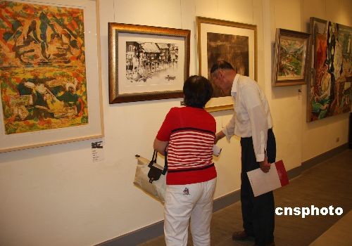 圖為臺灣藝術愛好者在欣賞“海峽兩岸繪畫聯展”。 中新社發 耿軍 攝
