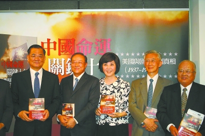 7月7日下午,臺當(dāng)局“考試院長”關(guān)中(左二)在臺北舉行《中國命運(yùn),關(guān)鍵十年》新書發(fā)布會。該書是關(guān)中對1937年至1947年間的“美國與國共談判真相”進(jìn)行研究而編成的,重現(xiàn)了當(dāng)年對日抗戰(zhàn)、國共內(nèi)戰(zhàn)談判等歷史場景。中國國民黨榮譽(yù)主席連戰(zhàn)(左一)等出席發(fā)布會。陳榮富 攝